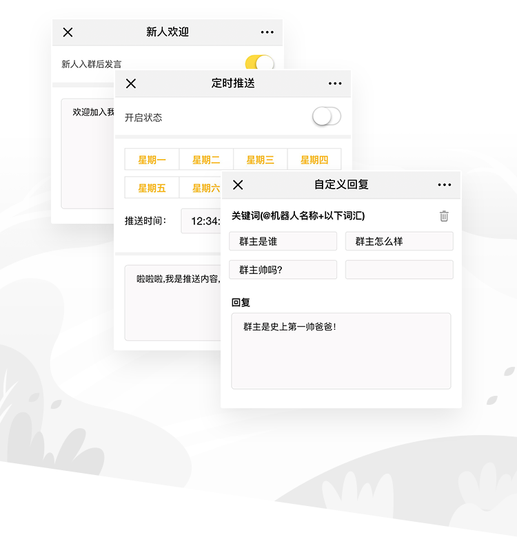 使用二狗的入群欢迎、定时推送、自定义回复等功能。重复的事情交给二狗,打造智能社群,全天周到服务。