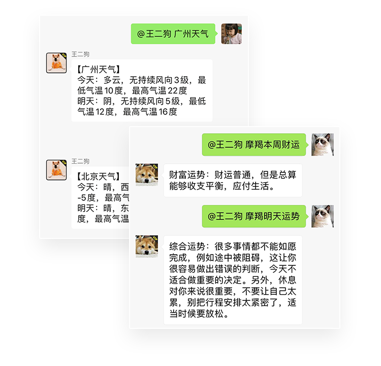 使用二狗的智慧查询功能,不管天气、星座、快递都是一句话的事。二狗是您群里的贴心小助手。